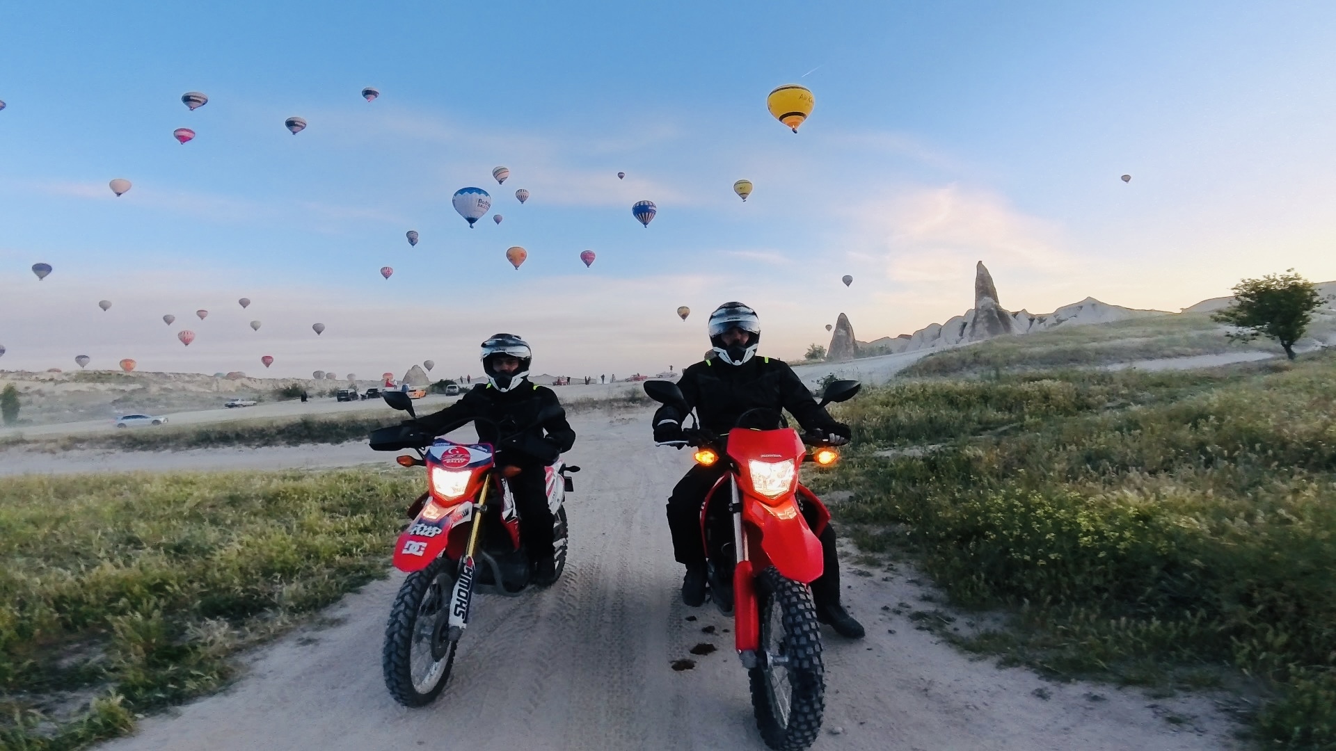 After the balloons take off, we begin our off-road Enduro ride through Cappadocia’s valleys, canyons, and trails. Led by an experienced local guide, you’ll explore secret paths, panoramic viewpoints, and untouched areas far from the crowds. We’ll stop at scenic points to take photos, shoot videos, and enjoy the incredible sunrise atmosphere before returning to the base after the balloon landings.